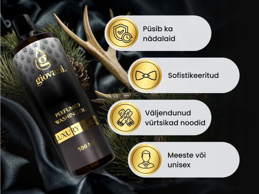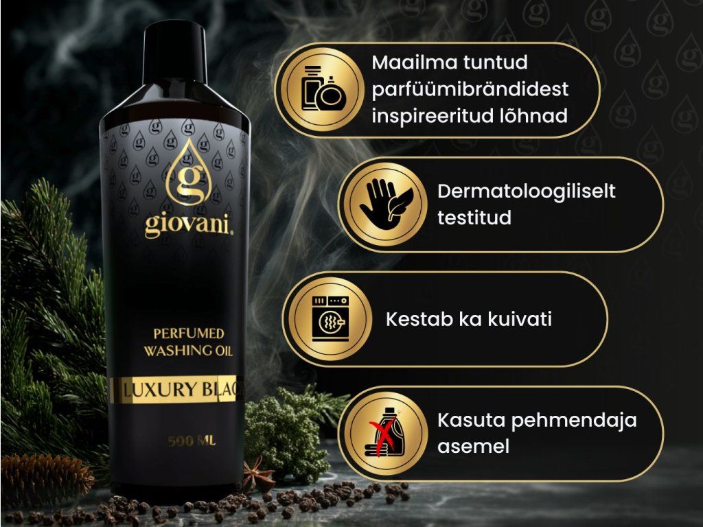 Vürtsikate ja lilleliste parfüümõlide kombinatsioon loob ülima lõhnaelamuse selle aldehüüdliku lõhna kujul - GIOVANI® Luxury Black pesulõhnastaja.